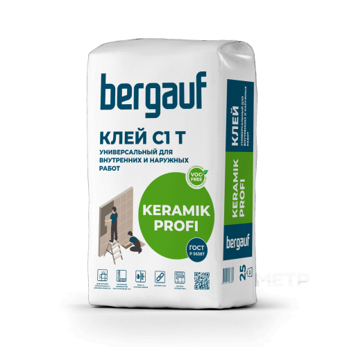 Клей для керамогранита Keramik Profi Bergauf 25 кг, рекомендован к использованию при монтаже различных видов плитки: керамической и крупноформатной, керамогранита и маловпитывающей плитки, природного и искусственного камня. Применяется в помещениях с нормальной и повышенной влажностью: ванных комнатах, балконах, цоколях и фасаде. Устраняет неровности стен и полов до 1 см.